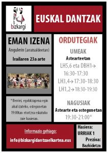 19-20 ikasturtean izena emateko epearen irekiera. Arratsaldeetan angulerin, irailaren 23 arte. Informazio gehiago hemen. Erdu dantzara!