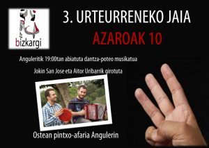 Badira 3 urte Bizkargi sortu zenetik. Ospakizun honetan gurekin bat egitera gongidatzen zaitugu. 19:00tan Anguleritik hasita, dantza-poteoa egingo dugu herriko kale eta tabernetatik. Jokin San Jose eta Aitor Uribarri ere gurekin izango dira beraien triki eta pandero soinuekin giroa alaitzeko. Aukera polita izango da elkarrekin dantzan ibili eta ondo pasatzeko. Ostean, Angulerira bueltatuko gara dantzariek […]